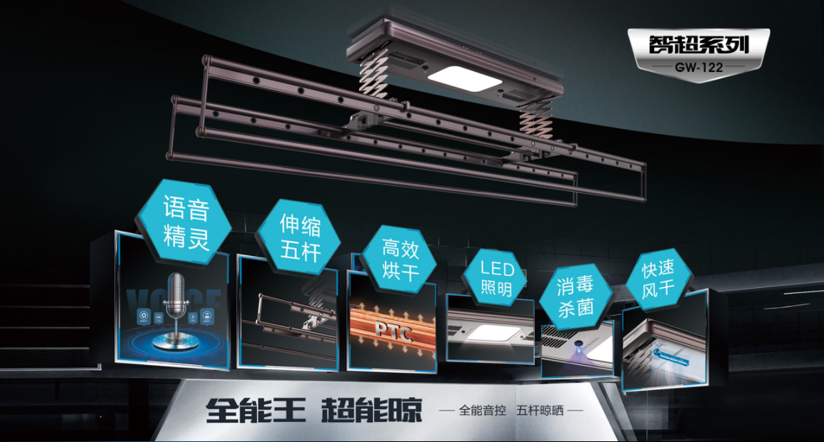 像乐鱼智能晾衣机GW-122系列,4伸缩杆加1小晾杆的设计就非常实用了。伸缩杆可已在1.6米到2.4米间自由切换,晾晒容量增加50%,最大承重35Kg,可实现同时晾晒10个人的衣物。利用中间的小晾干晾晒孩子衣物、贴身衣物和毛巾等小物件能最大限度的节省空间,并因正对消毒灯,达到最优的消毒效果。